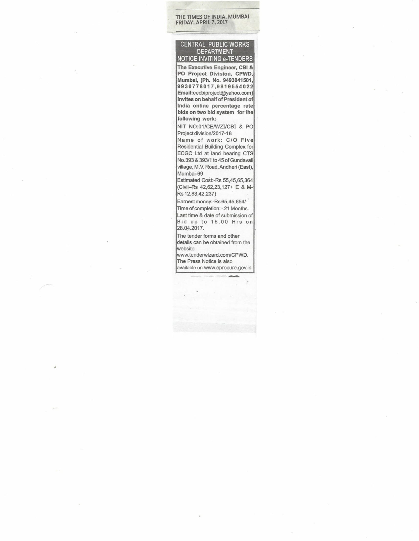 CPWD invites tenders for construction of Residential Buildings of ECGC, at Andheri, Mumbai Click Here for Advertisement